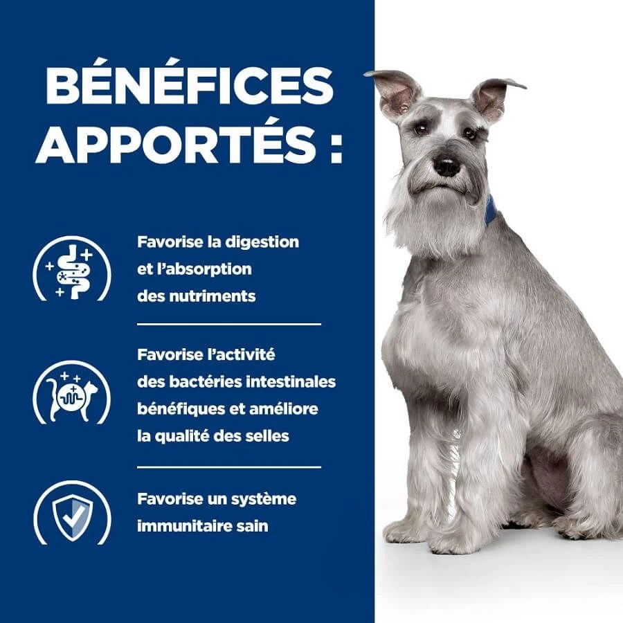 Sa formule contient la technologie des ingrédients Hill’s ActivBiome+. Il s’agit d’un mélange exclusif de fibres prébiotiques pour nourrir le microbiome intestinal tout en aidant à diminuer les troubles digestifs. Elle contient un mélange unique de prébiotiques et de gingembre.