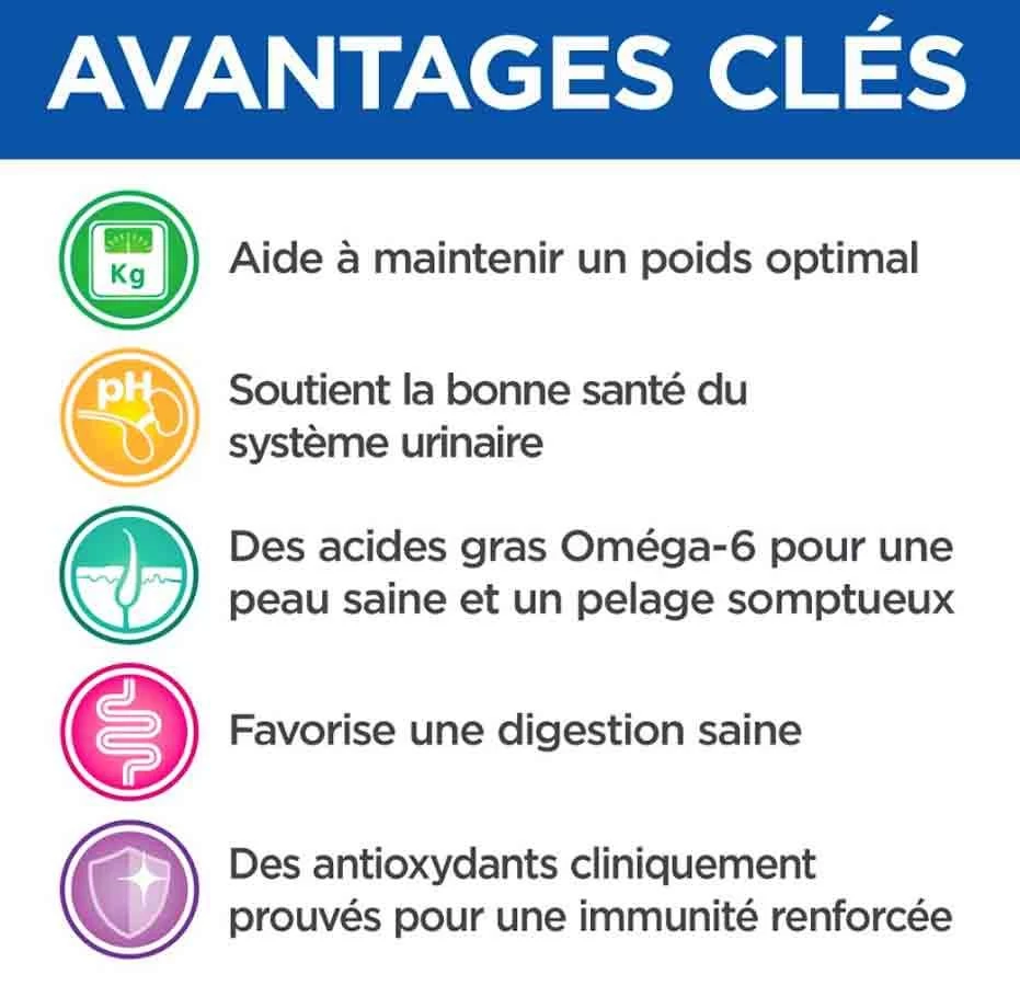 - Niveaux contrôlés de magnésium, de phosphore et de calcium pour favoriser un système urinaire sain
