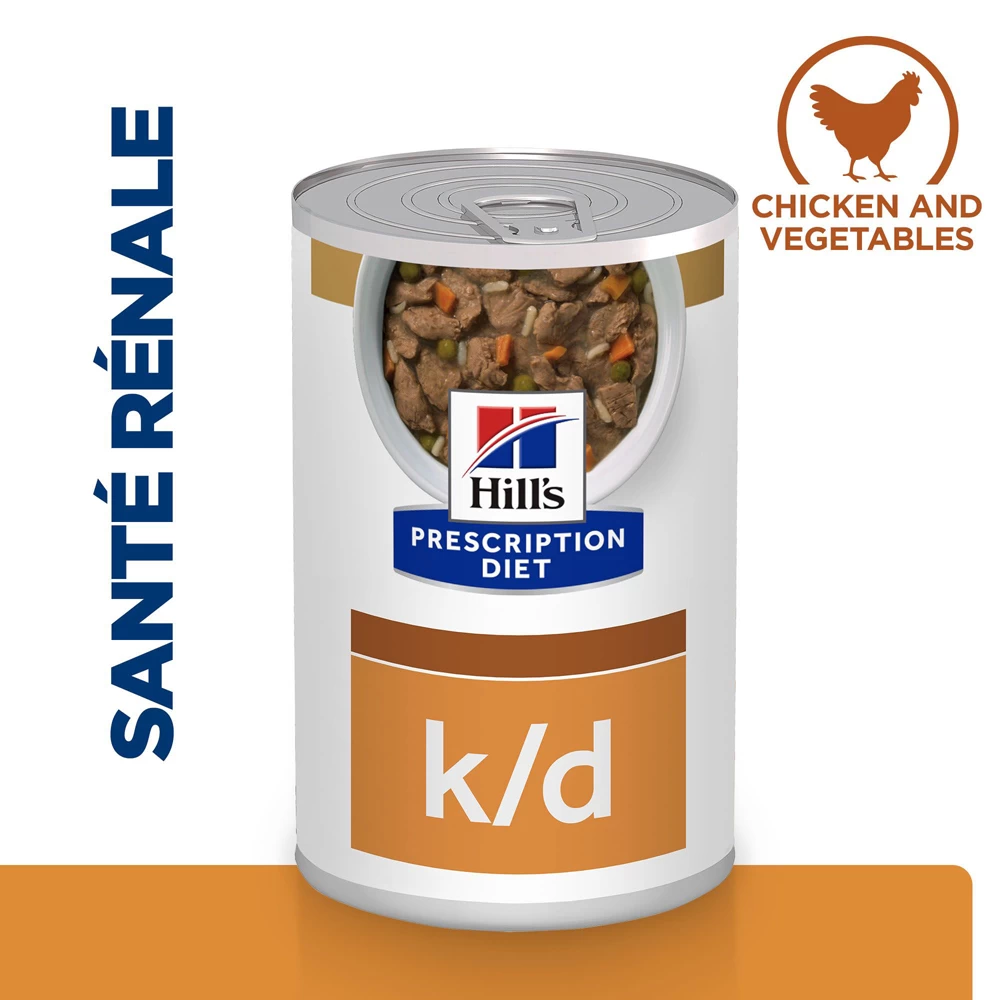 Les nutritionnistes et vétérinaires de Hill’s ont conçu la nutrition clinique Hill’s Prescription Diet k/d pour aider à protéger la fonction rénale vitale de votre chien, susciter l’appétit et augmenter sa consommation d’aliment. Cet aliment est élaboré avec du poulet et a un goût délicieux que votre chien va adorer. En fait, Prescription Diet k/d est une nutrition cliniquement prouvée pour améliorer & prolonger la qualité de vie.